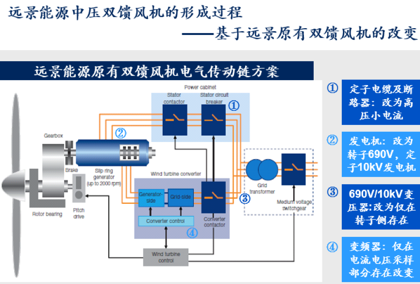 下圖具體展示了遠景中壓風(fēng)機的拓?fù)浼捌渑c傳統(tǒng)雙饋風(fēng)機的差別。