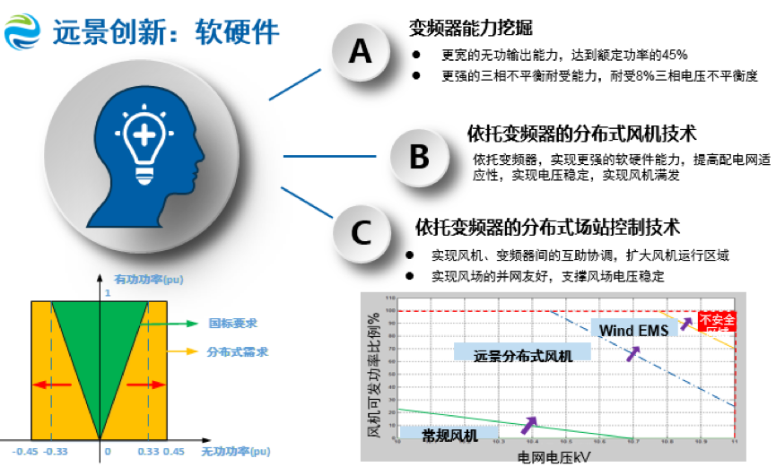 不僅如此,為了進一步配合分散式/分布式發(fā)電,除了對拓?fù)溥M行改進外,同時還增加了關(guān)鍵控制技術(shù)。比如高穿及零穿能力,電壓控制、頻率控制等能力,除此之外,還在三相不平衡、無功補償?shù)确矫娴哪芰ι献隽诉M一步拓展,同時與EMS系統(tǒng)相配合,大幅提升遠景中壓風(fēng)機在分布式風(fēng)場中的運行范圍。