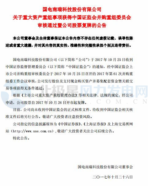 國(guó)電南瑞于10 月25 日收到中國(guó)證券監(jiān)督管理委員會(huì)的通知,其發(fā)行股份及支付現(xiàn)金購(gòu)買(mǎi)資產(chǎn)并募集配套資金暨關(guān)聯(lián)交易事項(xiàng)獲得無(wú)條件通過(guò)。經(jīng)公司申請(qǐng),國(guó)電南瑞股票自 2017 年 10 月 26 日開(kāi)市起復(fù)牌。目前