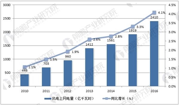 中國風(fēng)電上網(wǎng)電量占總發(fā)電量比例逐年增加,2016年風(fēng)電上網(wǎng)電量為2410億千瓦時,占總發(fā)電量的比重達(dá)4.08%, 超越核電(3.56%)和光伏(1.12%)成為我國第一大新能源發(fā)電形式。隨著國家能源局一些列消納措施的落地,風(fēng)電上網(wǎng)電量逐漸攀升,棄風(fēng)限電有望逐步緩解,行業(yè)逐步轉(zhuǎn)向市場化。