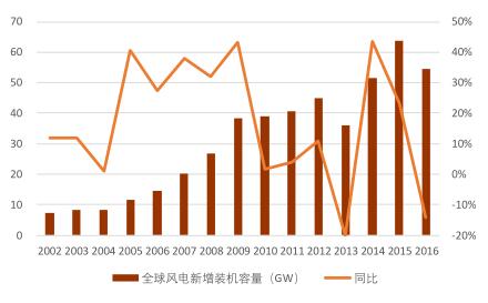 全球風(fēng)電新增裝機(jī)容量,2002-2009 年經(jīng)歷了高速發(fā)展期,年均復(fù)合增速達(dá)到 27%,2010-2016 年,波動(dòng)較大,整體發(fā)展進(jìn)入平穩(wěn)期,年均復(fù)合增速為 5%,但增量的絕對(duì)值較大。