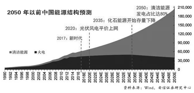 2050年中國的能源結(jié)構(gòu)會是什么樣?假設(shè)從2017年開始我國每年的發(fā)電量增長為前三年發(fā)電量增長的均值,以此為基礎(chǔ)預(yù)測每年的發(fā)電量。以 “到2035年,可再生能源對化石能源進(jìn)入全面存量替代的階段”和“到2050年時,可再生能源在電力消費(fèi)中的比重達(dá)到80%”兩個論斷為依據(jù),預(yù)測火電每年的的發(fā)電量情況(假設(shè)2035年前后火電每年增長率的增長/下降速度相同),以及清潔能源的發(fā)展?fàn)顩r。