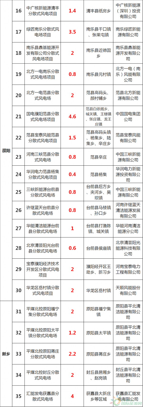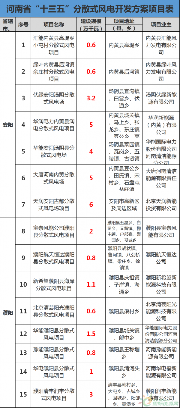 今天(12月6日),河南省發(fā)改委不發(fā)了《關于下達河南省“十三五”分散式風電開發(fā)方案的通知》以及河南省“十三五”分散式風電開發(fā)方案項目表。124個風電項目,共計規(guī)模210.7萬千瓦!濮陽、洛陽、平頂山、永城是規(guī)劃項目最多的地區(qū)。