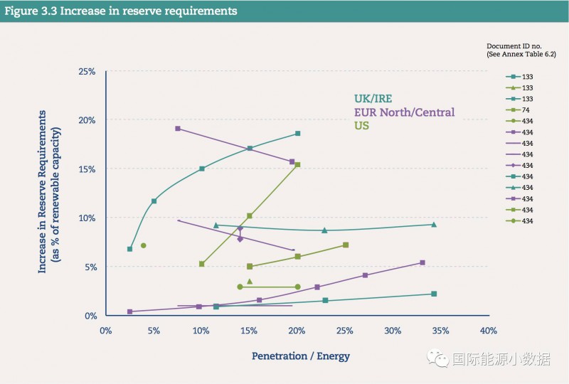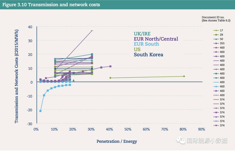 風(fēng)電光伏的系統(tǒng)成本首先要考慮相應(yīng)增加備用電源容量(reserve requirements)。如果風(fēng)電光伏發(fā)電占到電力需求的30%情況下,因?yàn)閭溆秒娫匆笤黾拥某杀炯s為5英鎊/兆瓦時(shí)(合人民幣4.3分/千瓦時(shí))。