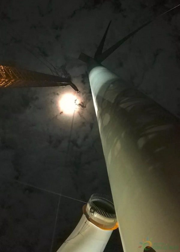 汪經(jīng)理:在項目前期,由于一些原因?qū)е马椖窟M(jìn)度滯后,風(fēng)機(jī)吊裝又恰逢泰國的雨季,經(jīng)常會有雷雨天氣,考慮項目的整體進(jìn)度,業(yè)主要求7*24小時不間斷吊裝。夜間吊裝面臨最大的挑戰(zhàn)是能見度低,即使照明措施再多也達(dá)不到白天的效果,只能保證起吊區(qū)域和人員作業(yè)區(qū)域的照明充足,吊裝要時刻關(guān)注吊車及吊物不能與塔筒或其它物體相撞。另外一個挑戰(zhàn)就是人員在晚上作業(yè)容易疲勞。我們現(xiàn)場工程師也分為白班和夜班,由于夜班要在晚上連續(xù)工作12小時左右,夜班結(jié)束后,我會安排現(xiàn)場工程師連續(xù)休息兩個白天后才能繼續(xù)工作,在吊裝期間我們大概經(jīng)歷了四十來個夜班,直到在完成最后一臺風(fēng)機(jī)的吊裝,項目沒有發(fā)生一起安全事故。