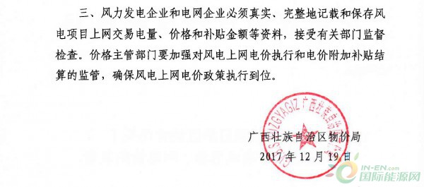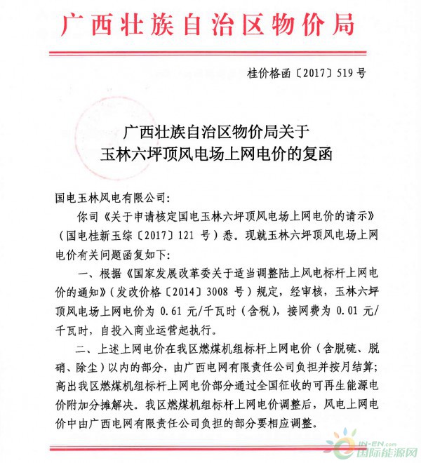 今天(12月27日),廣西發(fā)改委發(fā)布了《廣西壯族自治區(qū)物價局關于玉林六坪頂風電場上網(wǎng)電價的復函》,文件稱:經(jīng)審核,玉林六坪頂風電場上網(wǎng)電價為0.61元/千瓦時(含稅),接網(wǎng)費為0.01元/千瓦時,自投入商業(yè)運營起執(zhí)行。