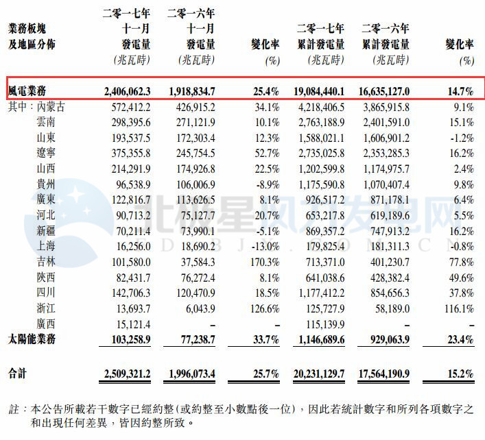 2017年11月,華能新能源完成總發(fā)電量25 09億千瓦時(2,509,321 2兆瓦時),同比增長25 7%。其中,風電發(fā)電量為24 06億千瓦時(2,406,062 3兆瓦時),同比增長25 4%。截至2017年11月31日止11個月,華能新能源完成