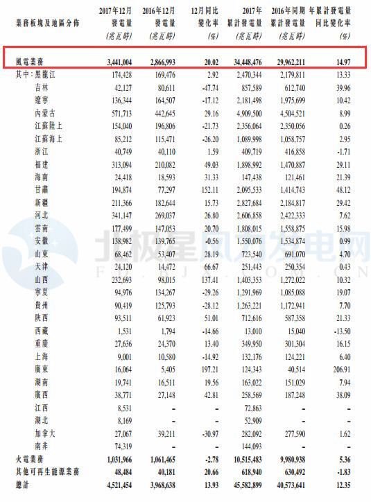 龍?jiān)措娏?017年12月風(fēng)電發(fā)電量34.41億千瓦時(shí) 同比增加20.02%