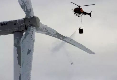 海上濕度較大,在嚴寒時葉片可能結(jié)冰,造成風(fēng)力機發(fā)電能力下降,積冰嚴重時甚至可能導(dǎo)致葉片斷裂。在高緯度地區(qū),寒冷的冬季通常也是取暖用電高峰,而葉片結(jié)冰會損失年發(fā)電量1%~10%,極端地區(qū)甚至能達到20%~50%。為此,工程師們開發(fā)出了多種除冰方法,其中被動除冰是在葉片表面涂以特殊涂料,目前應(yīng)用最廣的是超疏水涂層,可降低葉片與水、冰之間的黏結(jié)性。而黑色烤漆可在白天借助陽光的熱量除冰。此外,還有能夠滲出可降低結(jié)冰點的抑制劑的概念涂層等尚處于實驗室階段的技術(shù)。主動除冰則是在葉片表面安裝熱電阻元件或加熱葉片內(nèi)部空氣,使葉片溫度處于0℃以上。高緯度地區(qū)的風(fēng)力機一般需要結(jié)合主動加熱和被動涂層的除冰能力。