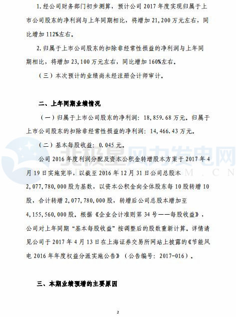 節(jié)能風(fēng)電預(yù)計(jì) 2017 年度實(shí)現(xiàn)歸屬于上市公司股東的凈利潤為 40,100 萬元左右,同比增加 21,200 萬元左右,增幅 112%左右;歸屬于上市公司股東的扣除非經(jīng)常性損益的凈利潤為 37,600 萬元左右,同比增加 23,100 萬元左右,增幅 160%左右。