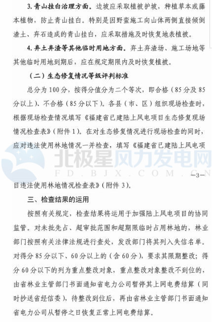 北極星風(fēng)力發(fā)電網(wǎng)小編從通知中發(fā)現(xiàn),專項(xiàng)檢查重點(diǎn)針對(duì)項(xiàng)目道路建設(shè)、風(fēng)機(jī)周邊防護(hù)、青山掛白治理、棄土棄渣等臨時(shí)用地植被恢復(fù)情況,并且對(duì)生態(tài)修復(fù)等級(jí)評(píng)判分為合格、不合格二個(gè)等次。針對(duì)專項(xiàng)檢查結(jié)果,對(duì)違法違規(guī)使用林地的風(fēng)電企業(yè),林業(yè)部門將按有關(guān)法律法規(guī)查處,發(fā)改部門將其列入失信名單。對(duì)生態(tài)修復(fù)工作不達(dá)標(biāo)、效果差的,要求限期整改,對(duì)整改仍不到位的,暫停其上網(wǎng)電費(fèi)結(jié)算。