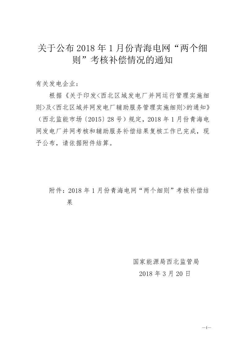 根據(jù)《關(guān)于印發(fā)<西北區(qū)域發(fā)電廠并網(wǎng)運行管理實施細則>及<西北區(qū)域并網(wǎng)發(fā)電廠輔助服務管理實施細則>的通知》(西北監(jiān)能市場〔2015〕28號)規(guī)定,2018年1月份青海電網(wǎng)發(fā)電廠并網(wǎng)考核和輔助服務補償結(jié)果復核工作已完成,現(xiàn)予公布,請依據(jù)附件結(jié)算。