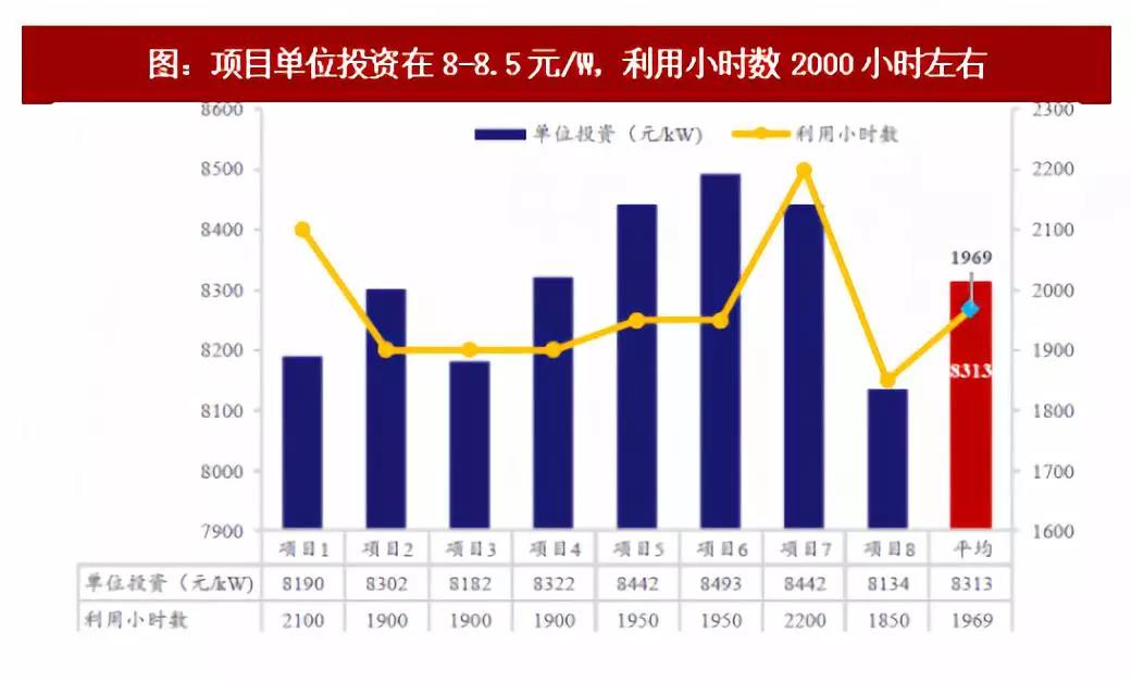▼圖:項目單位投資在8-8.5元/W,利用小時數(shù)2000小時左右
