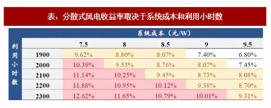 考慮到系統(tǒng)成本的不斷下降,以及利用小時數(shù)提升,IV類資源區(qū)分散式風電項目經濟性將進一步提升,內部收益率處于8%-12%區(qū)間。預計利用小時數(shù)每增加10%,或系統(tǒng)成本每下降10%,IRR增加1-1.5個百分點。