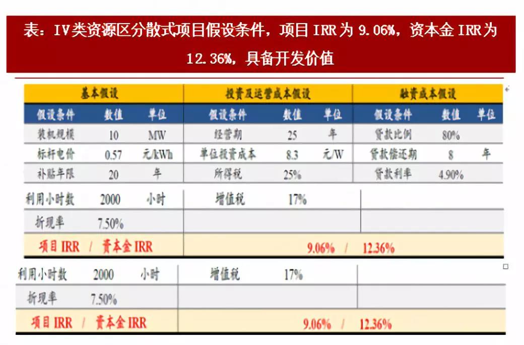 對比來看,分散式單位成本較西北集中式高10%。而相較于低風速區(qū)集中式,并無顯著前期投資成本差異。因此,下文收益率測算模型以8.3元/W系統(tǒng)建設成本作為基礎假設。