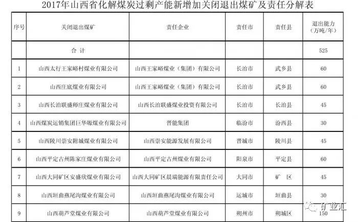 2017年5月9日,山西省首次發(fā)布2017年煤炭行業(yè)化解過剩產(chǎn)能關(guān)閉退出煤礦名單,包括同煤集團等10家煤企旗下18座煤礦,退出產(chǎn)能為1740萬噸,如今加上此次新增525萬噸產(chǎn)能,山西省2017年退出產(chǎn)能將達到2265萬噸,居中國第1位。