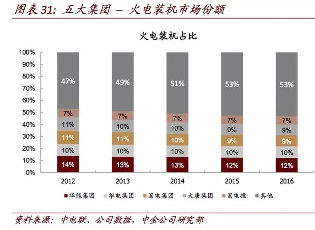 小機(jī)組關(guān)停等舉措使得行業(yè)集中度回升。五大發(fā)電集團(tuán)的市場(chǎng)份額不斷縮減,從2012年火電裝機(jī)和總發(fā)電量占比53%/47%,逐年下降至2016年47%/41%。