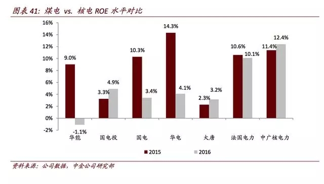 2014-2016年該公司的ROE分別穩(wěn)定在10.5%/10.6%/10.1%。而中廣核電力(純核電運(yùn)營標(biāo)的)在2014-2016年的ROE分別為13.7%/11.4%/12.4%。煤電和核電的合并或可幫助煤電企業(yè)提升資產(chǎn)回報(bào)率。