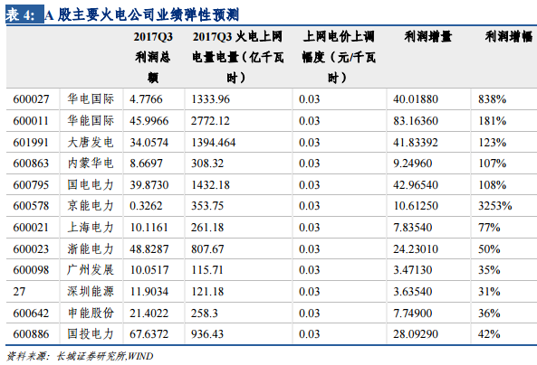 電價(jià)上調(diào)有望顯著改善火電行業(yè)業(yè)績(jī):按照每千瓦時(shí)上調(diào)3分測(cè)算,根據(jù)2017年三季報(bào)數(shù)據(jù),華電國(guó)際利潤(rùn)增幅在838%,華能國(guó)際181%,大唐發(fā)電123%,內(nèi)蒙華電107%,國(guó)電電力108%等。
