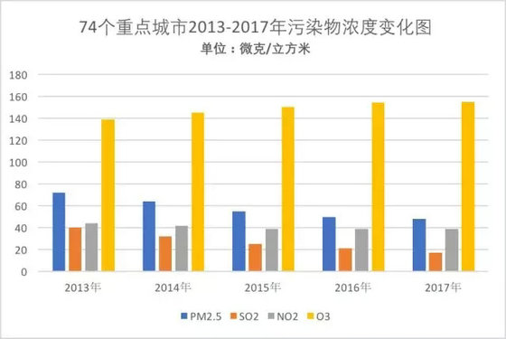 與全國的臭氧濃度增加的趨勢相一致,2017年的74個重點城市臭氧平均濃度值為155微克/立方米,比2013年增加了11.5%,其中32個城市超過國家二級標(biāo)準(zhǔn)(160微克/立方米)。53個城市出現(xiàn)臭氧污染加劇的現(xiàn)象,其中湖州、邢臺、肇慶、太原、哈爾濱、廈門市的同比上升幅度達(dá)到30%以上。