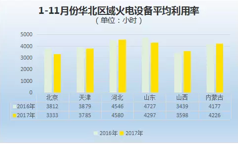 2017年1-11月華北區(qū)域北京、天津、山東火電設(shè)備平均利用小時(shí)數(shù)分別為3333小時(shí)、3785小時(shí)、4297小時(shí),與上年同期相比,下降479小時(shí)、94小時(shí)、430小時(shí)。河北、山西、內(nèi)蒙古與上年同期相比,有小幅度增長(zhǎng),分別為4580小時(shí)、3598小時(shí)、4226小時(shí)。