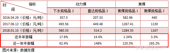 我們看一下就具體煤種價(jià)格情況,根據(jù)中國(guó)太原煤炭交易中心的數(shù)據(jù),截止2018年1月15日,動(dòng)力煤以及焦煤的價(jià)格半年來(lái)均有所上漲,其中動(dòng)力煤的價(jià)格漲幅較大,比如動(dòng)力煤品種的下水規(guī)格品2價(jià)格為580.33元/噸,近半年時(shí)間漲了17.6%。如果將時(shí)間上延至2016年4月份,兩種煤炭?jī)r(jià)格的漲幅均非常驚人。