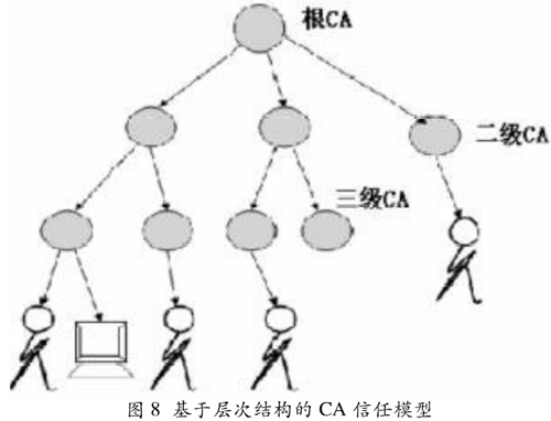 根CA具有一個(gè)自簽名的證書,根CA依次對(duì)它下面的CA進(jìn)行簽名,層次結(jié)構(gòu)中葉子節(jié)點(diǎn)上的CA用于對(duì)安全個(gè)體進(jìn)行簽名。對(duì)于個(gè)體而言,它需要信任根CA,中間的CA可以不必關(guān)心(透明的);同時(shí)它的證書是由底層的CA簽發(fā)的,沿著層次樹往上找,可以構(gòu)成一條證書鏈,直到根證書??v向加密裝置CA系統(tǒng)的部署拓?fù)鋱D如圖9所示。