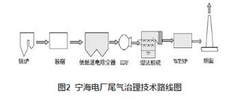 國華寧海電廠位于象山港底部,在寧海縣橋頭胡區(qū)強蛟鎮(zhèn)境內(nèi)下月岙村,距強蛟鎮(zhèn)約1.5公里,距寧??h城23公里,距寧波80公里,為保護(hù)環(huán)境,體現(xiàn)國企社會責(zé)任,響應(yīng)神華集團(tuán)“綠色發(fā)電計劃”,實現(xiàn)大氣污染物“近零排放”的要求,國華寧海電廠對#2、#4機組實施環(huán)保改造工程。國華寧海電廠粉塵“近零排放”技術(shù)路線主要采用低低溫電除塵器改造、濕法脫硫改造、WESP改造,其技術(shù)路線示意圖如圖2所示。