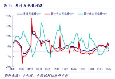 受益于用電需求創(chuàng)新高,2018 年一季度全國累計發(fā)電量實現(xiàn)高速增長。2018 年一季度全國累計發(fā)電量15,767 億千瓦時,同比增長8.1%。其中,火電發(fā)電量12,148 億千瓦時,同比提升7.0%;由于來水狀況較一般,水電發(fā)電量1,933 億千瓦時,同比降低0.3%。