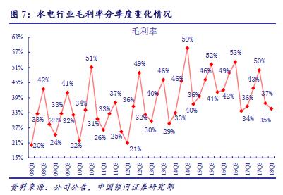 主要流域來水較多年均值偏枯,水電公司盈利能力略有下滑。2017 年水電行業(yè)綜合毛利率達到43.3%,同比下滑4.3 個百分點。2018 年一季度,水電毛利率34.6%,同比下降0.9個百分點。