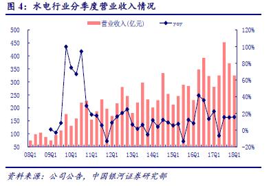 2017 年火電行業(yè)營收6,532.7 億元,同比上升19.3%;水電1,377.2 億元,同比增長10.4%。2018 年一季度,火電營收1,797.6 億元,同比提高17.4%;水電324.6 億元,同比增長15.6%。