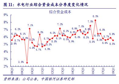 2017 年水電行業(yè)財務費用144.5 億元,同比降低7.5%;財務費用率10.5%,較2016 年下降2 個百分點。2018 年一季度,水電行業(yè)財務費用35.2 億元,同比下降1.5%;財務費用率10.8%,較去年同期下降1.9 個百分點,環(huán)比去年四季度增加0.6 個百分點;綜合資金成本5.5%,同比、環(huán)比分別下降0.4、0.3 個百分點。