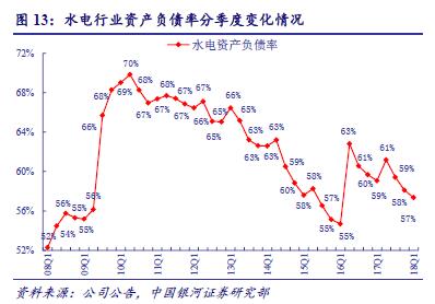 自2016 年底,火電資產(chǎn)負債率呈上升趨勢,水電持續(xù)下移。2017 年火電行業(yè)資產(chǎn)負債率達70.2%,同比提高2.8 個百分點;2018 年一季度69.7%,同比增加1.2 個百分點。2017年水電行業(yè)資產(chǎn)負債率為58.1%,同比降低1.6 個百分點;2018 年一季度57.4%,同比減少1.7 個百分點。