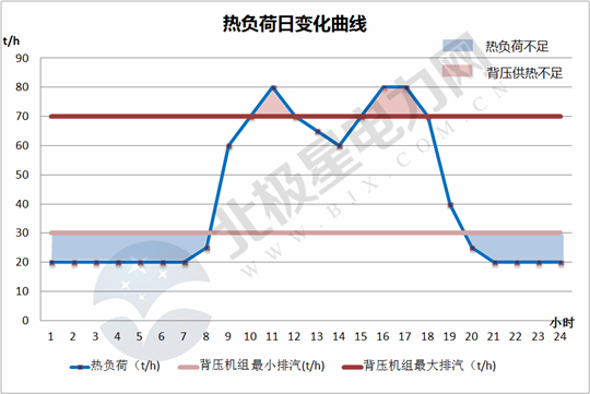 另一方面,隨著園區(qū)用熱負(fù)荷的增加,熱電廠的最大熱負(fù)荷增加80%,最小熱負(fù)荷不變?yōu)?0t/h,最大負(fù)荷為80t/h,熱負(fù)荷波動較大,典型熱負(fù)荷曲線如下所示。