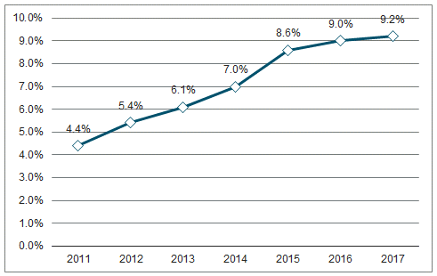 從發(fā)電量角度而言,2017 年水電發(fā)電量約為 12211 億千萬時,水電發(fā)電量增速由 2016 年的 3.8%降至 2.2%,水電發(fā)電量在全國全社會用電量中的占比也由 2016 年的 20.2%降至 2017 年的 19.4,這主要是因為最近兩年氣候原因?qū)е碌乃坎粔虺渥?,未來我們預計水電發(fā)電量在全社會用電量中的占比將維持在 20%左右;近年來,風電裝機容量在發(fā)電設備裝機總量中的占比不斷提高, 2017 年,風電發(fā)電量約為 3057 億千瓦時,約占全社會用電量的 4.8%,并網(wǎng)風電裝機容量占比達到 9.2%,整體上呈現(xiàn)逐漸上升的趨勢。