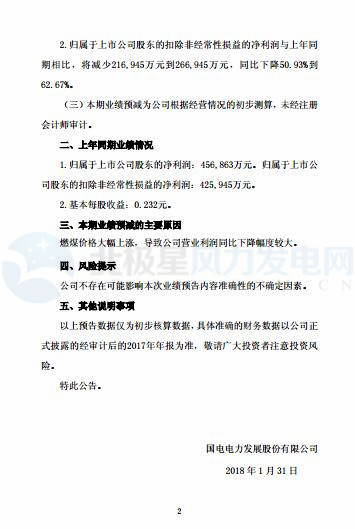 國電電力預(yù)計2017年實現(xiàn)歸屬于上市公司股東的凈利潤與上年同期相比,將減少226,863萬元到276,863萬元,同比下降49.66%到60.60%。