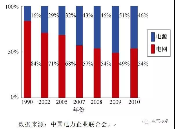 圖4 中國電源、電網(wǎng)投資占電力投資比重