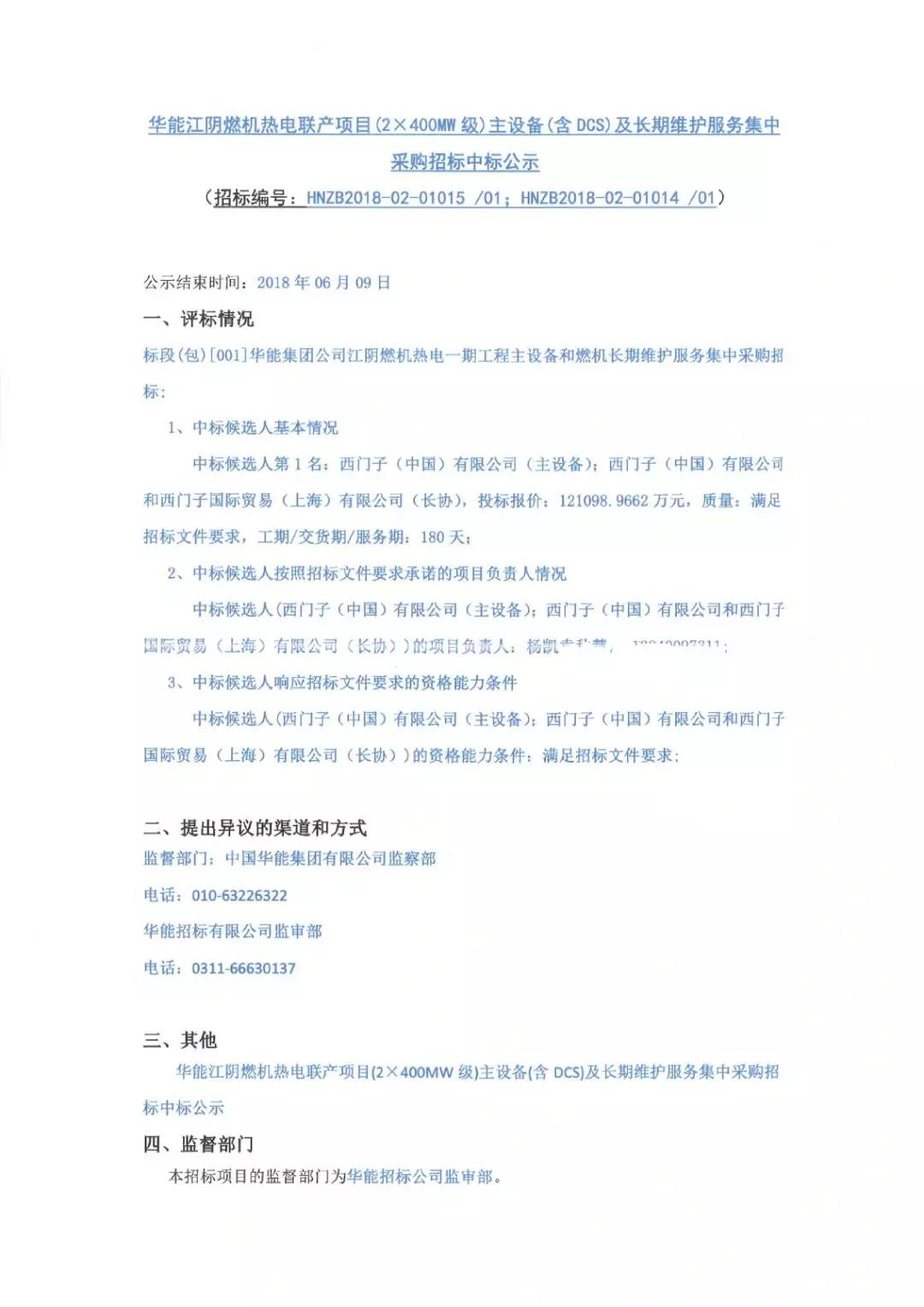 6月12日,華能江陰燃機(jī)熱電聯(lián)產(chǎn)項(xiàng)目(2×400MW級)主設(shè)備(含DCS)及長期維護(hù)服務(wù)集中采購招標(biāo)中標(biāo)公示: