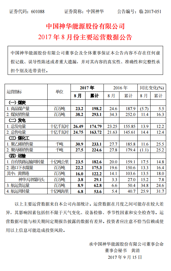 中國(guó)神華:1-8月發(fā)電量1747.9億千瓦時(shí) 同比增加12.2%