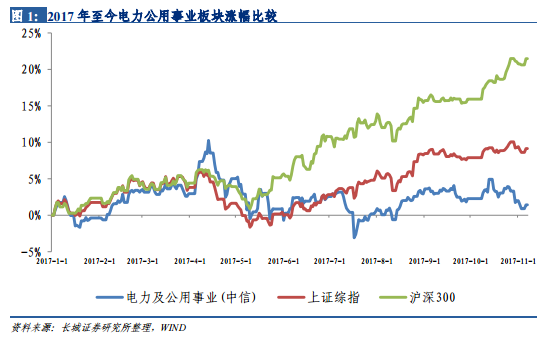 電力及公用事業(yè)指數(shù)跑輸大盤7.72%,火電跌幅為4.11%:2017年年初至今,中信電力及公用事業(yè)指數(shù)(ci005004.wi)漲幅為1.43%,同期上證綜指漲幅為9.15%,滬深300指數(shù)漲幅為21.48%,跑輸大盤7.72%,跑輸滬深300指數(shù)為20.05%。其中火電指數(shù)跌幅為4.11%,水電指數(shù)漲幅為18.15%