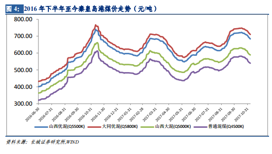 核心觀點:煤價從2016年下半年開啟上漲趨勢,吞噬火電企業(yè)利潤:2017年以來煤價有所回落,但不改上漲趨勢,價格仍處在高位:秦皇島港山西優(yōu)混(Q5500K)今年年初以來最高漲幅為18 6%(最高為722元 噸),大同優(yōu)混(Q5