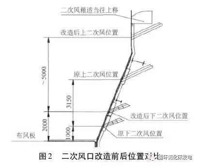 原下二次風(fēng)口位置距爐膛還原性區(qū)域過(guò)近,爐膛還原性區(qū)域不穩(wěn)定,二次風(fēng)分級(jí)燃燒效果不顯著,不利于抑制NOx生成。為此進(jìn)行二次風(fēng)配置改造,即下二次風(fēng)拉開(kāi)與一次風(fēng)距離,上二次風(fēng)提高至密相區(qū)上方,作為高效燃燒二次風(fēng),強(qiáng)化分級(jí)燃燒,增加爐膛密相區(qū)還原性氣氛,抑制NOx生成量,如圖2。