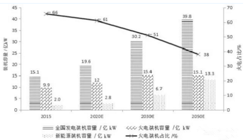 據中國電力企業(yè)聯(lián)合會預測, 2020年、2030年、2050年是我國火電產業(yè)發(fā)展的重要節(jié)點,未來我國火電產業(yè)將進入衰退期。2020年, 火電裝機容量占總裝機容量61%, 2030年下降到51%, 到2050年進一步下降至38%,而新能