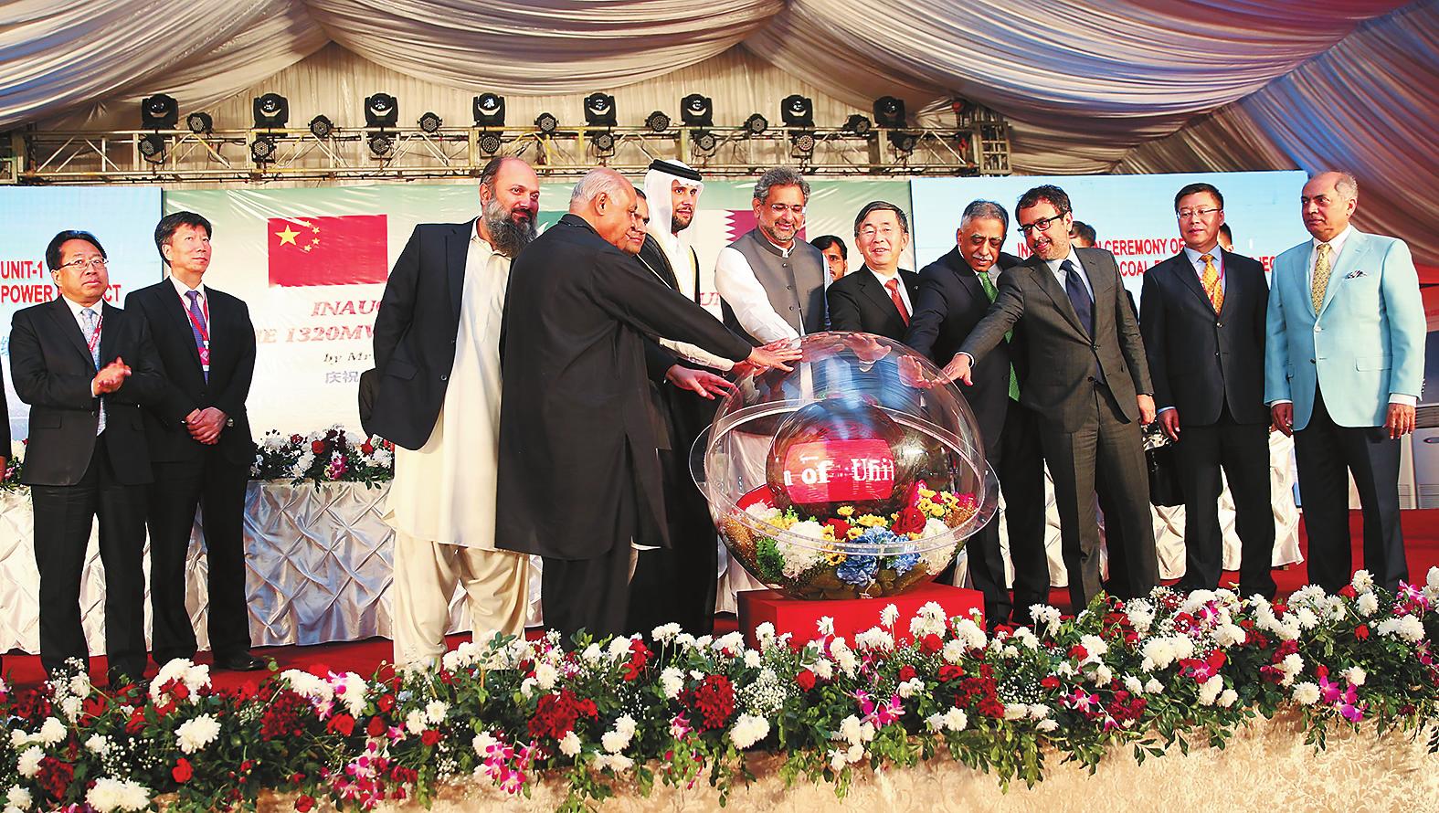 巴基斯坦總理阿巴西(右六)、中國電建董事長晏志勇(右五)、卡塔爾AMC公司董事長賈西姆(右七),以及與會嘉賓共同觸摸啟動機組的水晶球。 康從欽 攝  900個日夜逐夢前行,7000余名中巴建設者同力協(xié)契,造