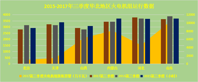 從火電機組設備利用率上看,三季度,華北地區(qū)處于全國較高水平。其中河北、山東、內蒙古、天津,分別達到3798小時、3647小時、3448小時、3239小時,高于全國平均水平681小時、530小時、331小時、122小時。去2016年同期相比,華北各個?。ㄗ灾螀^(qū)、直轄市)有明顯的下降。其中北京、山東、內蒙古分別低于去年同期365小時,234小時、3小時。山西、河北、天津則分別則高于去年同期110小時、100小時、68小時。