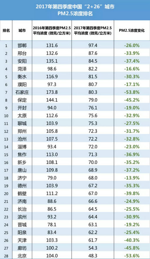“2+26”城市在2017年第四季度的改善幅度明顯,第四季度整體平均濃度同比下降達(dá)33.1%,達(dá)到了全國(guó)365城市第四季度整體改善情況(11.0%)的三倍以上,其中石家莊市和北京市PM2.5平均濃度同比改善率超過(guò)50%;廊坊市、天津市和保定市PM2.5平均濃度同比改善率超過(guò)40%。