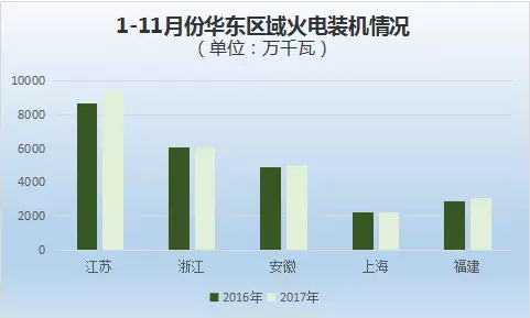 2017年1-11月,江蘇、浙江、安徽火電裝機容量較高,高于全國平均水平,分別為9380萬千瓦、6098萬千瓦、5028萬千瓦,高于上年同期719萬千瓦、50萬千瓦、134萬千瓦。