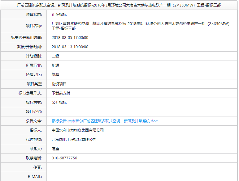 廠前區(qū)建筑多聯(lián)式空調(diào)、新風(fēng)及排煙系統(tǒng)招標(biāo)-2018年3月環(huán)境公司大唐吉木薩爾熱電聯(lián)產(chǎn)一期(2×350MW)工程-招標(biāo)三部工程名稱:大唐吉木薩