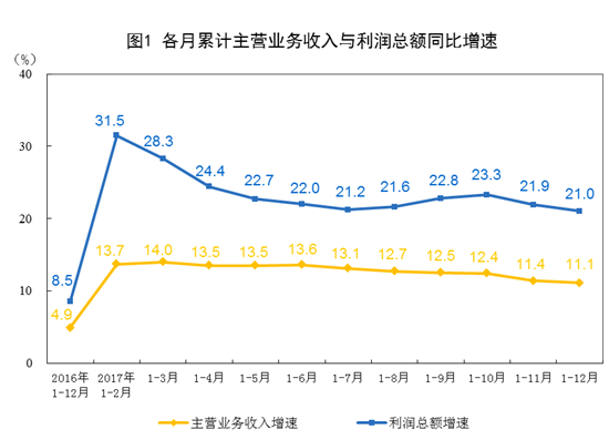 2017年12月份,規(guī)模以上工業(yè)企業(yè)實(shí)現(xiàn)利潤總額8241.6億元,同比增長10.8%,增速比11月份放緩4.1個百分點(diǎn)。