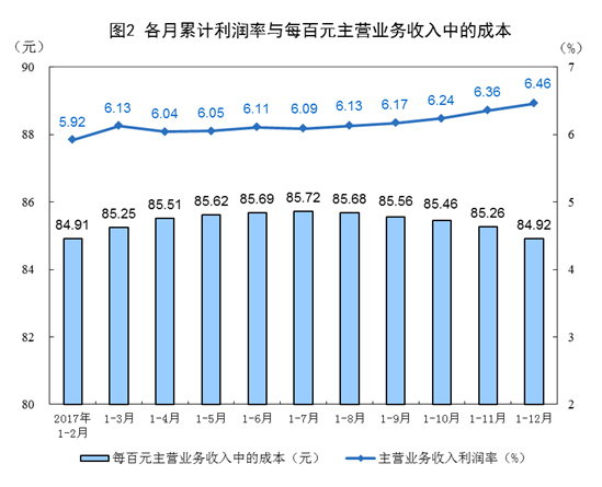 2017年,規(guī)模以上工業(yè)企業(yè)實(shí)現(xiàn)主營業(yè)務(wù)收入116.5萬億元,比上年增長11.1%;發(fā)生主營業(yè)務(wù)成本98.9萬億元,增長10.8%;主營業(yè)務(wù)收入利潤率為6.46%,比上年提高0.54個百分點(diǎn)。
